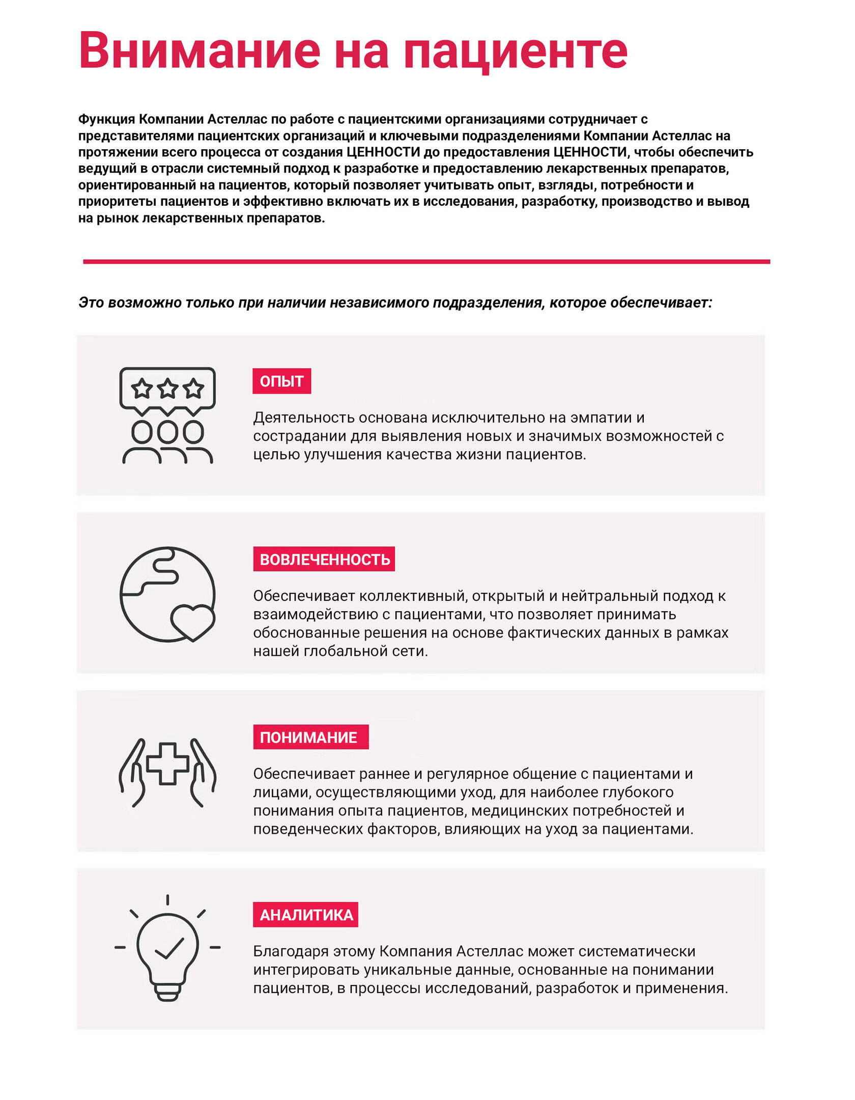 Создание активной и интегрированной культуры, ориентированной на пациента, во всей Компании Астеллас.