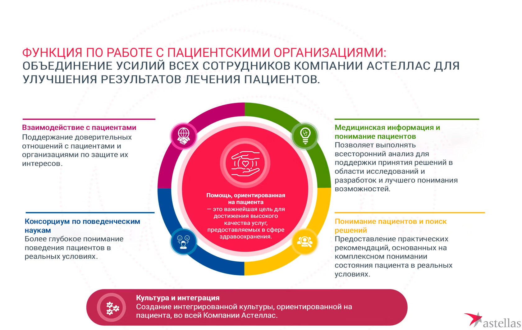 Функция Компании Астеллас по работе с пациентскими организациями занимается разработкой инновационных решений в области здравоохранения на основе глубокого понимания опыта пациентов, их медицинских потребностей и поведенческих факторов, влияющих на лечение. У нас есть общее видение, как лучше поддерживать и более точно понимать пациентов в реальных условиях, а также корпоративная культура, в основе которой лежит забота о пациентах.
